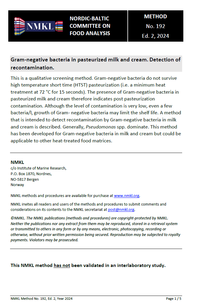New edition: NMKL 192 Gram-negative bacteria in pasteurized milk and cream. Detection of recontamination.