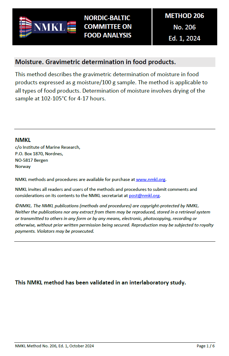 New method: NMKL 206. Moisture. Gravimetric determination in food products.