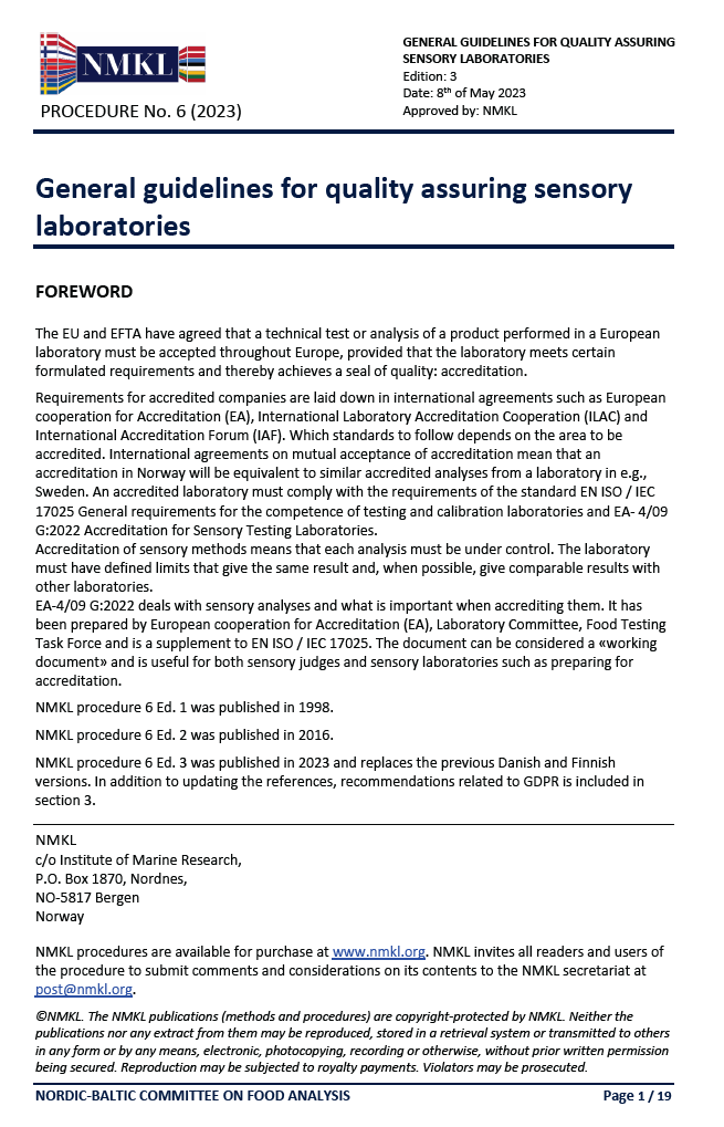 NMKL procedure 6 Ed. 3 was published in 2023 in English and replaces the previous Danish and Finnish versions. In addition to updating the references, recommendations related to GDPR is included.
