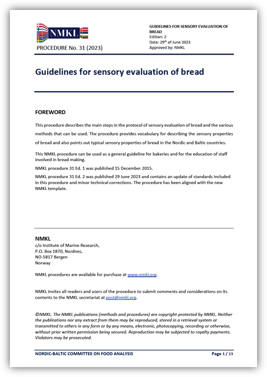 This procedure describes the main steps in the protocol of sensory evaluation of bread and the various methods that can be used. The procedure provides vocabulary for describing the sensory properties of bread and also points out typical sensory properties of bread in the Nordic and Baltic countries.
